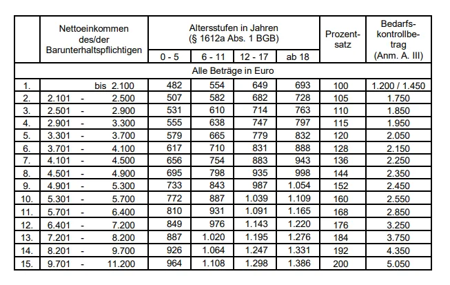 Dies hilft zur Kontrolle, da Du den Unterhalt für Deine Einkommensgruppe einfach ablesen kannst, ohne die Berechnung selbst vorzunehmen. Eine weitere Spalte ist der „Bedarfskontrollbetrag“, der angibt, wie viel von Deinem Einkommen nach der Unterhaltszahlung für Deinen eigenen Lebensunterhalt übrig bleibt. Beispielsweise sollen bei einem Einkommen von 5.400 Euro monatlich 2.550 Euro für den eigenen Bedarf zur Verfügung stehen.