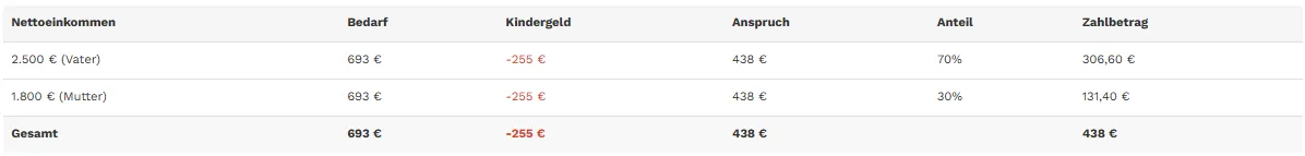 - Berechnung des Anteils des Vaters: Auch wenn die Mutter kein Einkommen hat, wird der gesamte Bedarf unter Berücksichtigung des Einkommens beider Elternteile berechnet. Der Anteil des Vaters wird dann gemäß seinem Nettoeinkommen und dem Selbstbehalt berechnet.